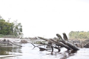 Juru mudi pompong, sebutan masyarakat lokal untuk perahu motor, acap kali harus memindahkan tuas pengendali kemudi dari kanan ke kiri. Kalau tidak cekatan, pompong pasti menabrak batang-batang kayu berdiameter paling kecil 20 sentimeter yang berserakan serta menyembul dari dalam sungai.