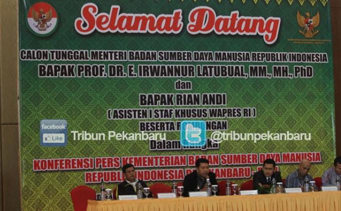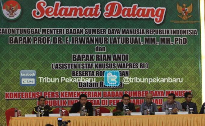 TRIBUNPEKANBARU.COM, PEKANBARU - Irwannur Latubual (kedua dari kiri) memberi keterangan pers di Hotel Aryaduta Pekanbaru, Rabu (18/3/2015). Irwannur mengaku sebagai calon tunggal Menteri Badan Sumber Daya Manusia Republik Indonesia dan mengklaim secara legalitas kementerian tersebut telah diakui pemerintah, kini kementrian tersebut berencana membuka kantor wilayah di Provinsi Riau. (*)
