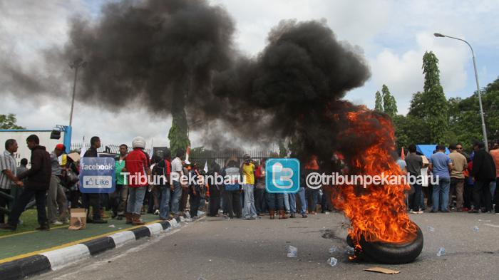 FOTO: Aksi Bakar ban Warnai Demo Buruh di Chevron