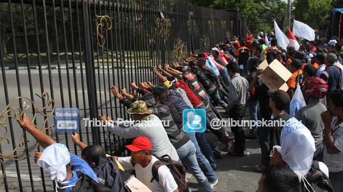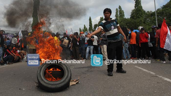 TRIBUNPEKANBARU.COM, PEKANBARU - Sejumlah buruh melakukan unjuk rasa di depan gate Chevron, Kec Rumbai Pesisir, Pekanbaru, Rabu (2/12/2015).