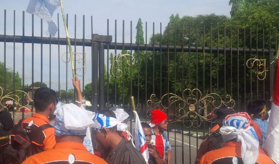 "Kuat juga pintunya. Ayo, tim kedua lanjutkan goyang pagarnya," teriak salah seorang pengunjuk rasa mengunakan pengeras suara.