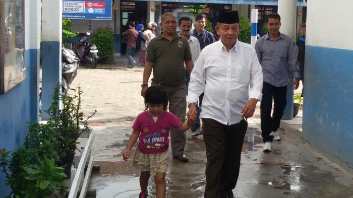 TRIBUNPEKANBARU.COM, DUMAI - Calon Walikota Dumai dari jalur independen, Amris mendatangi TPS 10 Kelurahan Bumi Ayu, Rabu (9/12/2015). Amris mendatangi TPS menggandeng cucu perempuannya.