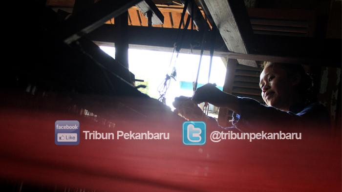 TRIBUNPEKANBARU.COM, PEKANBARU - Seorang pengerajin sedang menenun kain dengan cara tradisional dengan menggunakan Alat Tenun Bukan Mesin (ATBM) di Rumah Tenun Jalan Perdagangan, Kampung Bandar, Kecamatan Senapelan, Pekanbaru, Jumat (29/1/2016). Ada beberapa jenis motif tenun yang mampu dihasilkan dirumah kerajinan ini, diantaranya tenun motif siluang ataupun siku awan dengan harga berkisar antar harga Rp. 700.000 sampai dengan Rp. 2.000.000 untuk satu kain tenun.