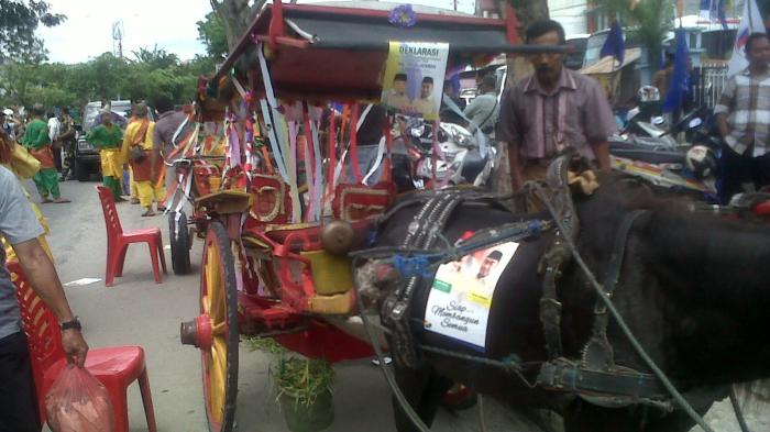 TRIBUNPEKANBARU.COM, PEKANBARU - Dua delman sudah disediakan untuk membawa Bakal Pasangan calon Ramli Walid - Irvan Herman Abdullah dari kantor DPW PAN Riau di Jalan Arifin Achmad menuju kantor KPU Kota Pekanbaru di Jalan Arifin Achmad.