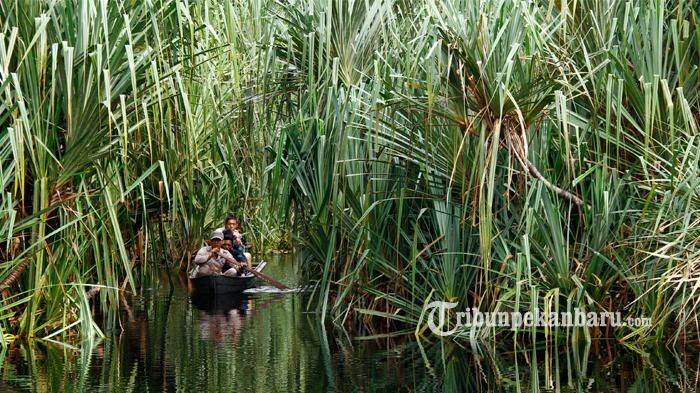 TRIBUNPEKANBARU.COM, PEKANBARU: PATROLI - Para ranger sedang melakukan patroli rutin untuk memantau titik api dan ilegal logging di sungai Sarkap kawasan Restorasi Ekosistem Riau (RER) PT Gemilang Cipta Nusantara (APRIL Grup) Teluk Meranti, Kabupaten Pelalawan, Selasa (1/11). Restorasi Ekosistem Riau merupakan program untuk mengembalikan keanekaragaman hayati pada lahan hutan terdegradasi yang dilakukan oleh April Group dengan mengucurkan dana 100 juta dolar AS untuk merestorasi hutan sesuai dengan konsep one to one, dimana setiap 1 hektare area hutan tanaman untuk 1 hektare konservasi. Tribun Pekanbaru/Doddy Vladimir