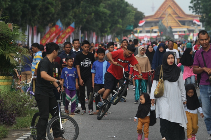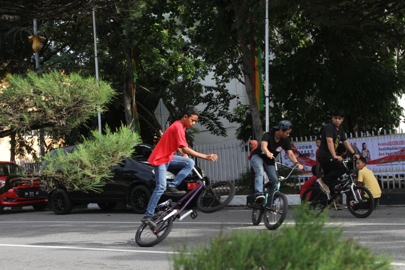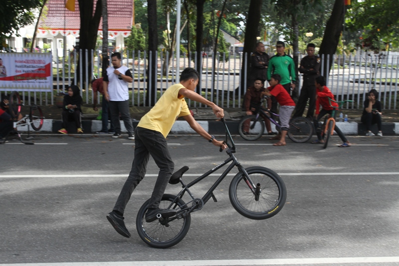 Pemain sepeda BMX berlatih di kawasan car free day (CFD) Jalan Gajah Mada, Pekanbaru, Minggu (13/8/2017). Gerakan-gerakan freestyle yang cukup sulit dilakukan tersebut cukup mengundang decak kagum para warga yang menontonnya. (TRIBUN PEKANBARU/THEO RIZKY)