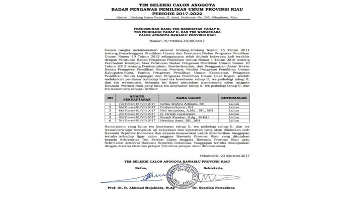 Enam besar calon anggota Bawaslu Riau sudah dikerucutkan dan diumumkan tadi malam (23/8/2017), yang juga diumumkan melalui website resmi Bawaslu Riau.