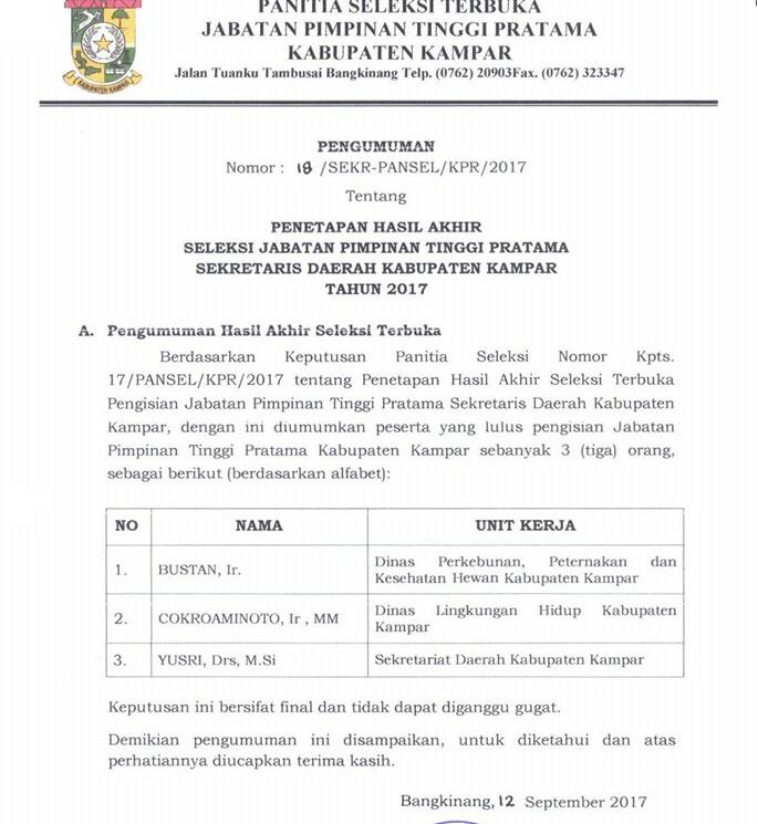 TRIBUNPEKANBARU.COM, BANGKINANG - Ketua Panitia Seleksi Terbuka Sekretaris Daerah Kampar, Syawir Hamid mengemukakan, pemilihan tiga nama hasil Seleksi Terbuka berdasarkan rangking.