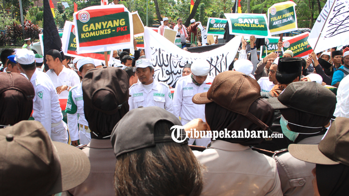 Ratusan massa yang tergabung dalam Gerakan Masyarakat Menuntut Keadilan (GMMK) Riau mendatangi Kantor DPRD Riau, Jumat (29/9). Massa yang terdiri dari beberapa ormas seperti FPI, PETA, HMI, dan lain-lain menuntut agar Pemerintah Indonesia untuk mencabut Perppu Nomor 2 Tahun 2017 tentang pembubaran Ormas dan ganyang PKI. Tribun Pekanbaru/Doddy Vladimir
