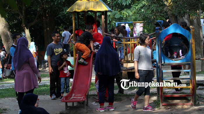 TRIBUNPEKANBARU.COM, PEKANBARU - Sejumlah warga bersama anak-anak bermain di Taman Kota, Jalan Dipenogoro, Pekanbaru, Minggu (10/8/2017).