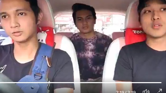 Dua orang laki-laki terlihat menaiki sebuah taksi online.