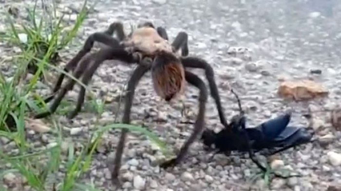 TRIBUNPEKANBARU.COM - Pertarungan seekor tarantula melawan tawon pemangsa tarantula (Tarantula Hawk) membuat satu keluarga terpana.