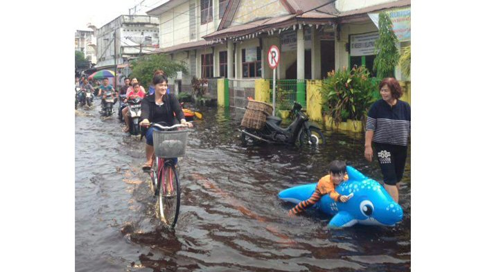 Lain hal dengan Bambang, Ayin (30) warga Jalan Imam Bonjol justru memanfaatkan genangan air untuk membahagiakan anaknya, Kelvin (3).