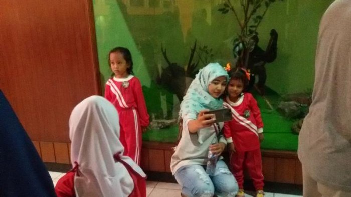 Para orangtua pun tak ketingggalan memanfaatkan moment ini, mereka pun berfoto selfie bersama anak mereka di dekat koleksi museum.