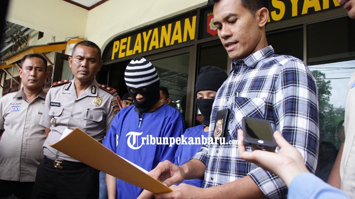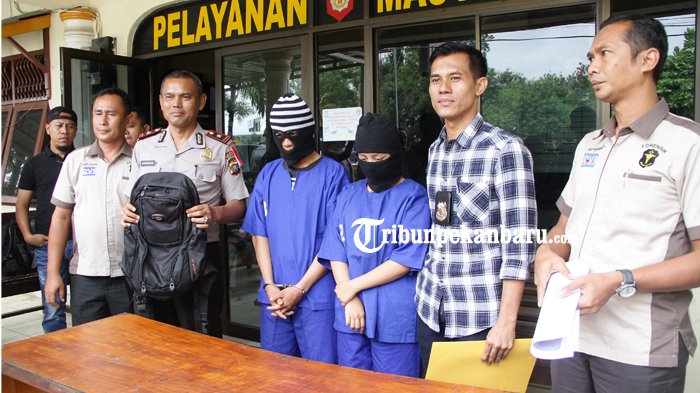 Dua tersangka aborsi RR (25) dan KRA (20) dihadirkan saat ekspose di Polsek Tenayan Raya, Pekanbaru, Rabu (7/3/2018). Pasangan kekasih ini nekat melakukam aborsi karena tidak mau menikah dan takut ketahuan orangtua. Orok berjenis kelamin laki-laki yang diperkirakan berusia enam bulan ini dikuburkan di halaman rumah RR. (Tribun Pekanbaru/Doddy Vladimir)
