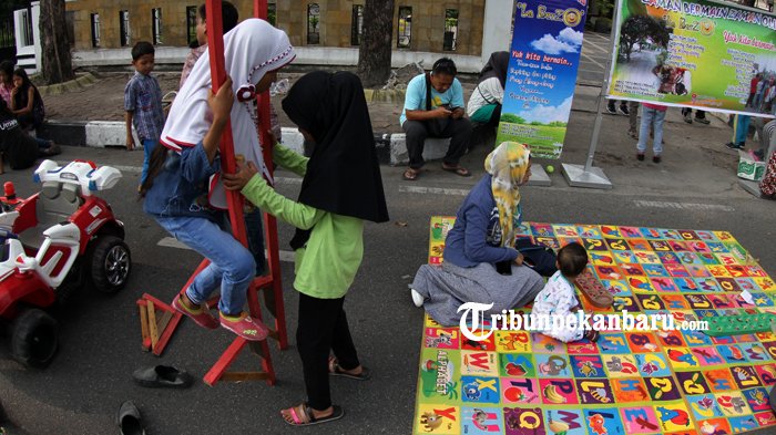 TRIBUNPEKANBARU.COM, PEKANBARU - Sejumlah warga Pekanbaru bersama anak-anak menikmati permainan tradisional di Laman Bermain Zaman Old di kawasan Car Free Day, Jalan Gajah Mada, Pekanbaru, Minggu (18/3/2018).