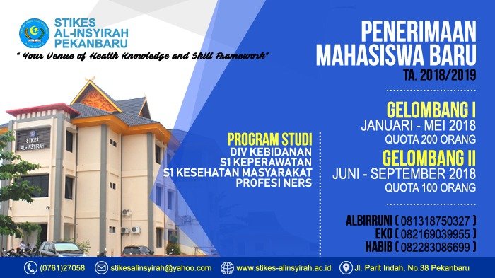 SEKOLAH Tinggi Ilmu Kesehatan (STIKES) AL-Insyirah Pekanbaru yang didirikan dengan SK. MENDIKNAS RI NO.161/D/O/2009, membuka penerimaan mahasiswa baru TA. 2018/2019.