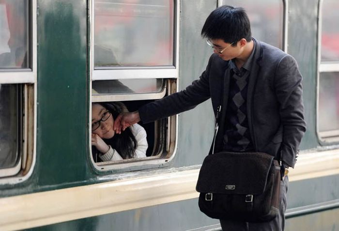 10. Seorang gadis muda mengucapkan selamat tinggal melalui jendel kereta api di Hefei, Povinsi Anhui.
