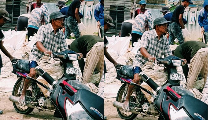 TRIBUNTEMBILAHAN.COM, KERITANG – Satu persatu bungkusan pasir tampak dengan cekatan dan sabar dibawa oleh Suriadi (78) menggunakan sepeda motor tua miliknya.