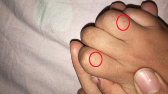 Tampak di tangan gadis itu ada bekas tusukan berbentuk titik, sebesar jarum.