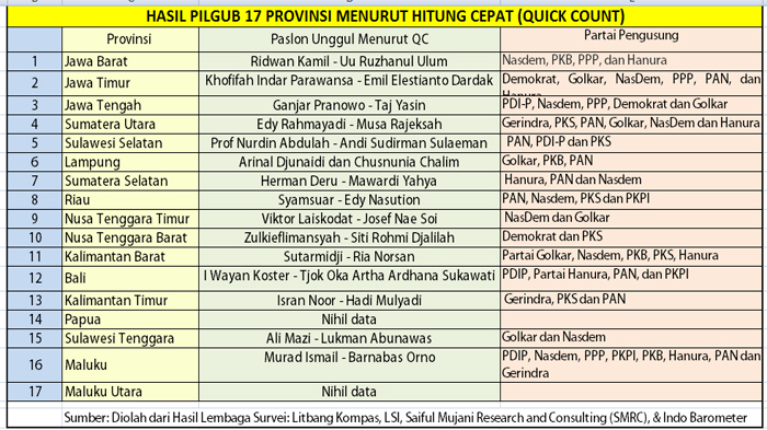 Inilah Hasil Quick Count 15 Gubernur-Wagub Terpilih Hasil Pilkada 2018 dan Parpol Pengusung