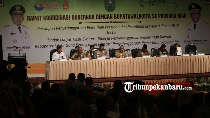 Deklarasi Pemilu tahun 2019 yang aman, damai, sejuk dan kondusif di Provinsi Riau digelar di Hotel Premiere Pekanbaru, Selasa (4/9/2018). Deklarasi yang dipimpin oleh Gubernur Riau Arsyadjuliandi Rachman tersebut diikuti Forkompimda, Bupati dan Walikota se Riau beserta Forkompimdanya. (TRIBUN PEKANBARU/THEO RIZKY).