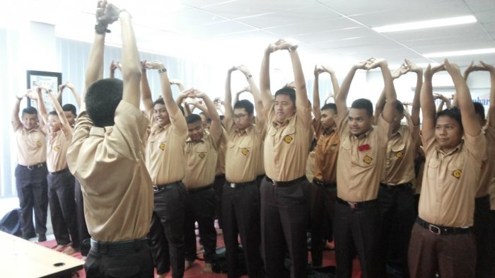 Agar lebih rileks dalam menerima informasi dari pihak Tribun Pekanbaru, News Manager Rinal Sagita bahkan mengaja siswa berolahraga ringan di tempat.