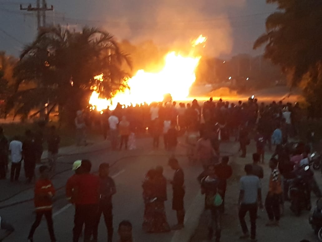 TRIBUNBENGKALIS.COM, BENGKALIS - Pipa gas milik PT Chevron Pasific Indonesia (CPI) mengalami bocor dan terbakar sekitar pukul 18.00 WIB di jalan lintas Duri-Pekanbaru tepatnya di daerah Balai Raja kecamatan Pinggir Bengkalis.