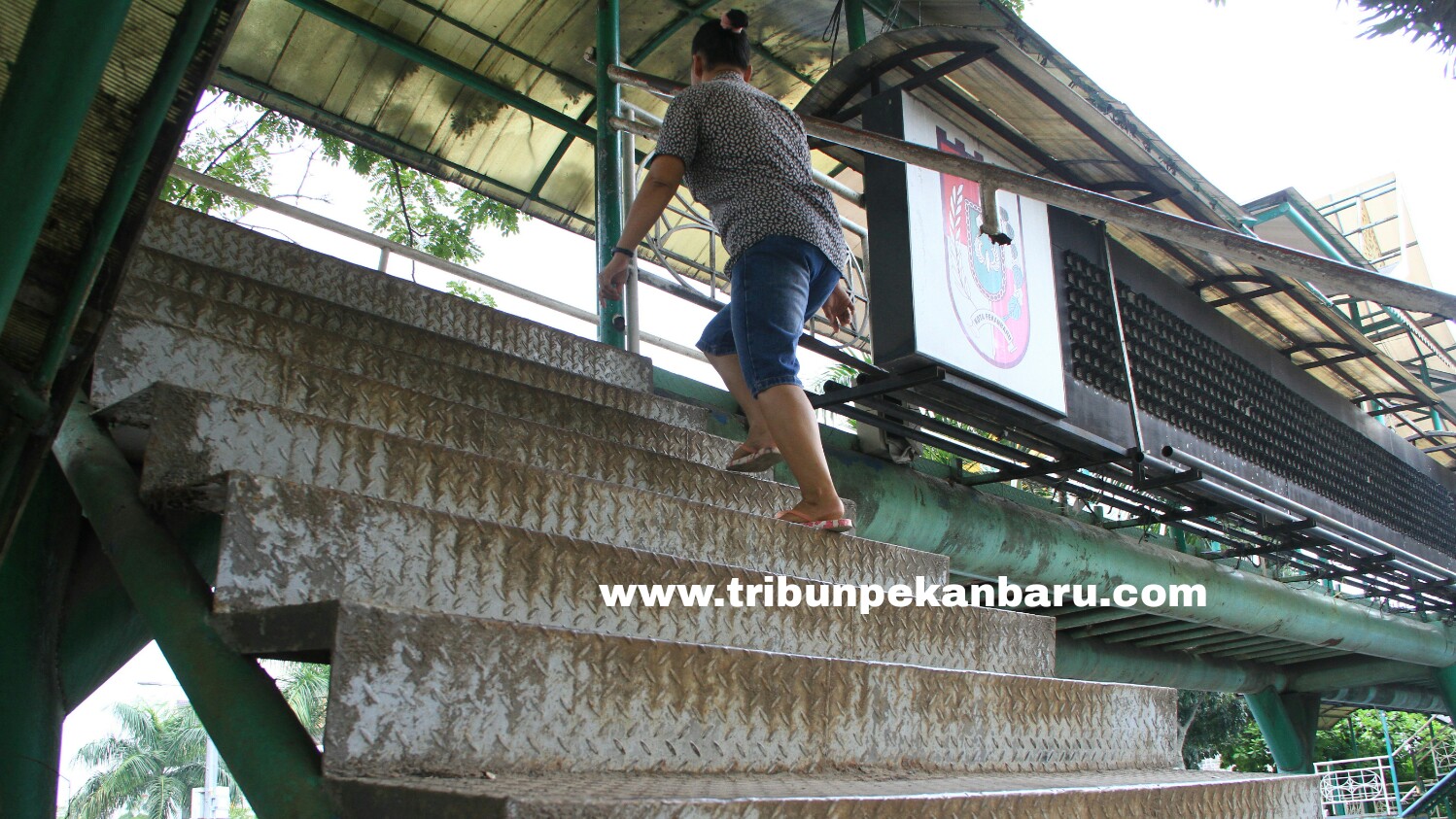TRIBUN PEKANBARU.COM - Warga sedang menaiki Jembatan Penyebrangan Orang (JPO) di Jalan Jenderal Sudirman yang kondisinya sangat memprihatinkan, Selasa (18/9/2018).