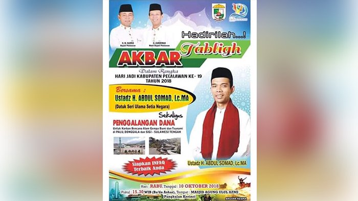 TRIBUNPELALAWAN.COM, PANGKALAN KERINCI - Ustaz Abdul Somad atau akrab disapa UAS direncanakan akan ceramah di Pangkalan Kerinci Kabupaten Pelalawan pada Rabu (10/10/2018) pekan depan.