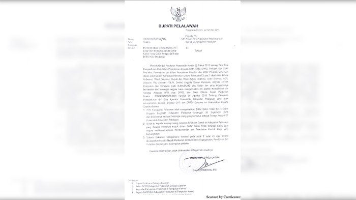 "Perihal pemberhentian tenaga honor/PTT yang telah ditetapkan dalam Daftar Calon Tetap Calon anggota DPR dan DPRD Kab. Pelalawan," demikian isi surat yang salinannya diperoleh tribunpelalawan.com, Selasa (9/10/2018).
