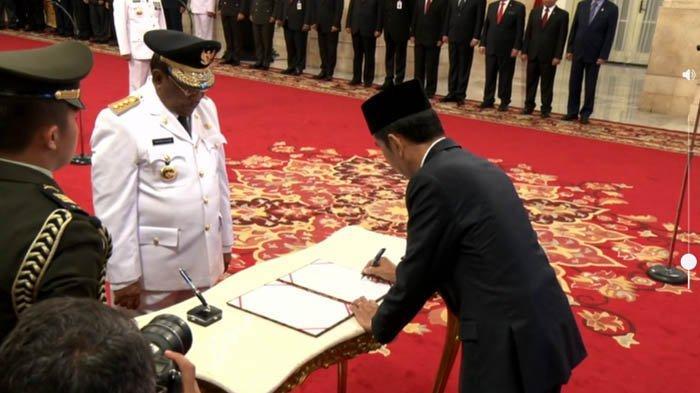 TRIBUNPEKANBARU.COM, PEKANBARU - Presiden Joko Widodo (Jokowi) memimpin jalannya pengambilan sumpah jabatan kepada Gubenur Riau definitif Wan Thamrin Hasyim dan Gubenur Bengkulu Rohidin Mersyah di Istana Negara, Seinin (10/12/2018) siang ini.