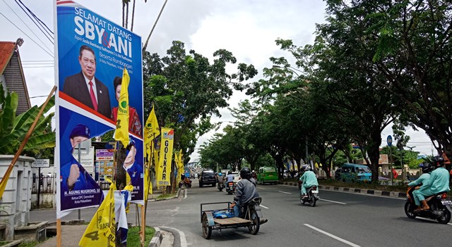 Spanduk yang dirusak salah satunya yang dipasang di depan Hotel Pangeran, tempat Ketua Umum Partai Demokrat Susilo Bambang Yudhoyono dan rombongan menginap.
