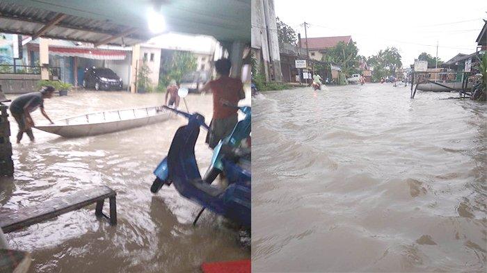 Di Jalan Pemda, saat banjir masih tinggi, sampan warga sampai terbawa banjir. Di jalan tersebut memang ada kerajinan yang membuat sampan. (*)