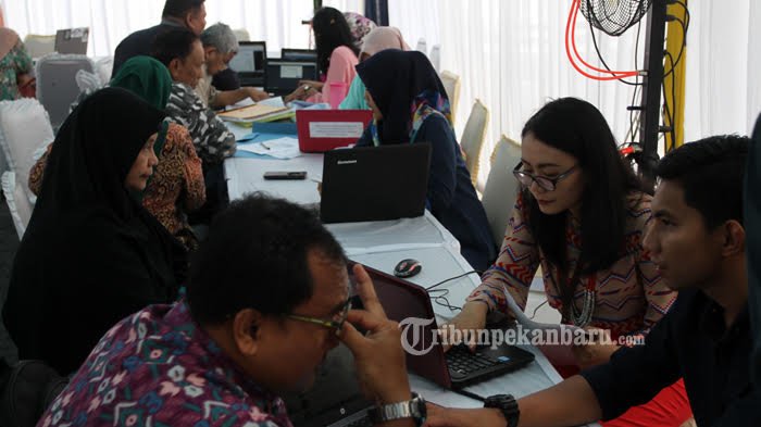 Para wajib pajak tengah memberikan laporan Surat Pemberitahuan (SPT) Tahunan di Kantor Kanwil Direktorat Jenderal Pajak Riau dan Kepulauan Riau, Pekanbaru