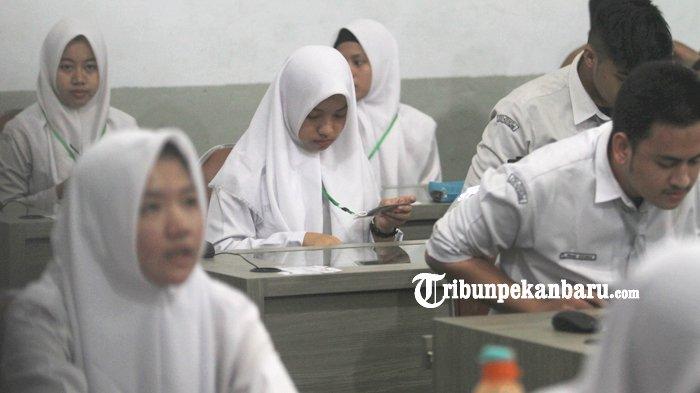 Sejumlah murid SMAN 1 bersiap-siap mengikuti Ujian Nasional Berbasis Komputer (UNBK) dengan mata pelajaran Bahasa Indonesia pada hari pertama, Senin (1/4/2019). (TRIBUN PEKANBARU/THEO RIZKY)