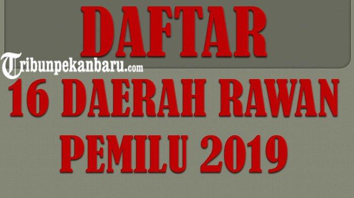 Daftar 16 daerah rawan konflik Pemilu 2019 yakni, Aceh, Sumatera Barat, Kepulauan Riau, Jambi, Bengkulu, Jawa Tengah, Banten, Jawa Barat, Yogyakarta, Kalimantan Utara, Kalimantan Timur, Papua, Sulawesi Tengah, Sulawesi Selatan, Nusa Tenggara Timur dan Sulawesi Utara.