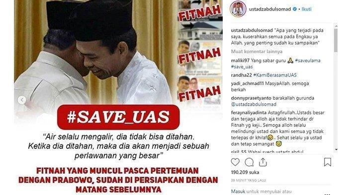 "Menjadi marah, hanya karena berbeda pilihan. Lalu marah berubah menjadi fitnah. Menunjukkan akal tak lagi mengikat nafsu. Semoga kita tetap jaga NKRI, dengan kelapangan hati," tulis UAS di akun Instagramnya.
