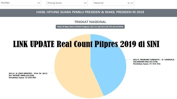 Hasil update real count KPU Kamis (2/5/2019) pasangan calon presiden dan wakil presiden nomor urut 01 Joko Widodo-Ma'ruf Amin, untuk sementara, mengungguli pasangan calon nomor urut 02 Prabowo Subianto-Sandiaga Uno.