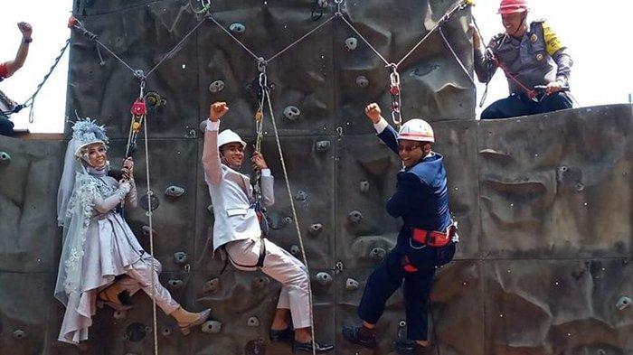 Betapa tidak, mereka baru saja melangsungkan pernikahan yang tak biasa. Mereka mengucap janji suci di panjat tebing (wall climbing) kompleks kampus 2 Universitas Muhammadiyah (UM) Magelang, Kabupaten Magelang, Selasa (6/8/2019).