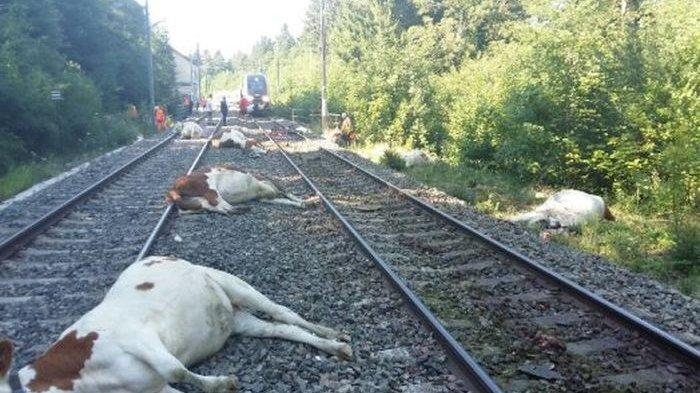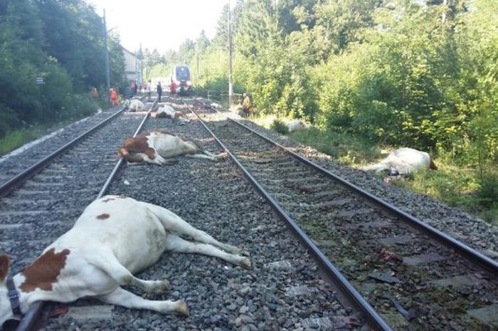 20 sapi tergeletak mati di rel karena ditabrak oleh kereta berkecepatan tinggi di rel di French Alps, Perancis.