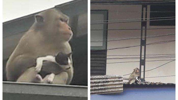 Tampak si monyet berkeliaran di atas atap sebuah rumah.