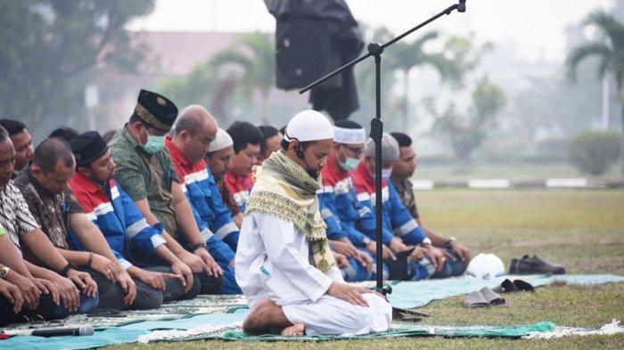 Salat yang dilaksanakan sebagai upaya meminta diturunkannya hujan ini diadakan di halaman Gedung Utama Kantor Pertamina RU II Dumai
