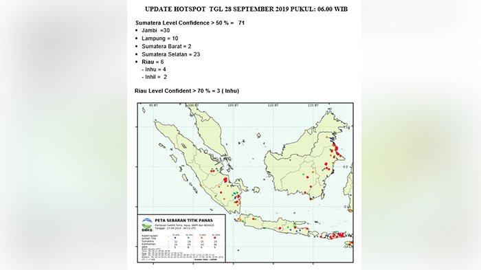 TRIBUNPEKANBARU.COM, PEKANBARU -- Jumlah titik panas di Provinsi Riau pada Sabtu (28/9) pagi ini terpantau di Badan Meteorologi, Klimatologi dan Geofisika (BMKG) Pekanbaru sebanyak 6 hotspot yang tersebar di Indragiri Hulu 4 titik dan di Indragiri Hilir 2 titik.