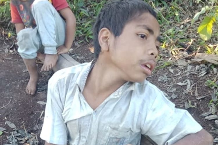 Ristan Akut, seorang anak berusia 16 tahun asal Desa Rana Kolong, Kecamatan Kota Komba, Kabupaten Manggarai Timur, Flores, NTT menderita lumpuh sejak lahir, Kamis (10/10/2019).(KOMPAS.COM/NANSIANUS TARIS)