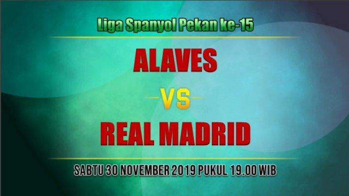 VIDEO Jadwal Siaran Langsung Liga Spanyol Pekan ke-15 Alaves vs Real Madrid TRIBUNPEKANBARU.COM-- Real Madrid akan melawat ke Alaves dalam pertandingan Liga Spanyol pekan ke-15. Pertandingan Alaves vs Real Madrid akan berlangsung di stadion Mendizorrotza, Vitoria-Gasteiz, Sabtu (30/11/2019) Duel Alaves vs Real Madrid dapat disaksikan live streaming di TV Online Bein Sports mulai pukul 19.00 WIB. Preview Pertandingan Kedua Tim: Head to Head Pertandingan terakhir: ALAVES Pertandingan terakhir: REAL MADRID