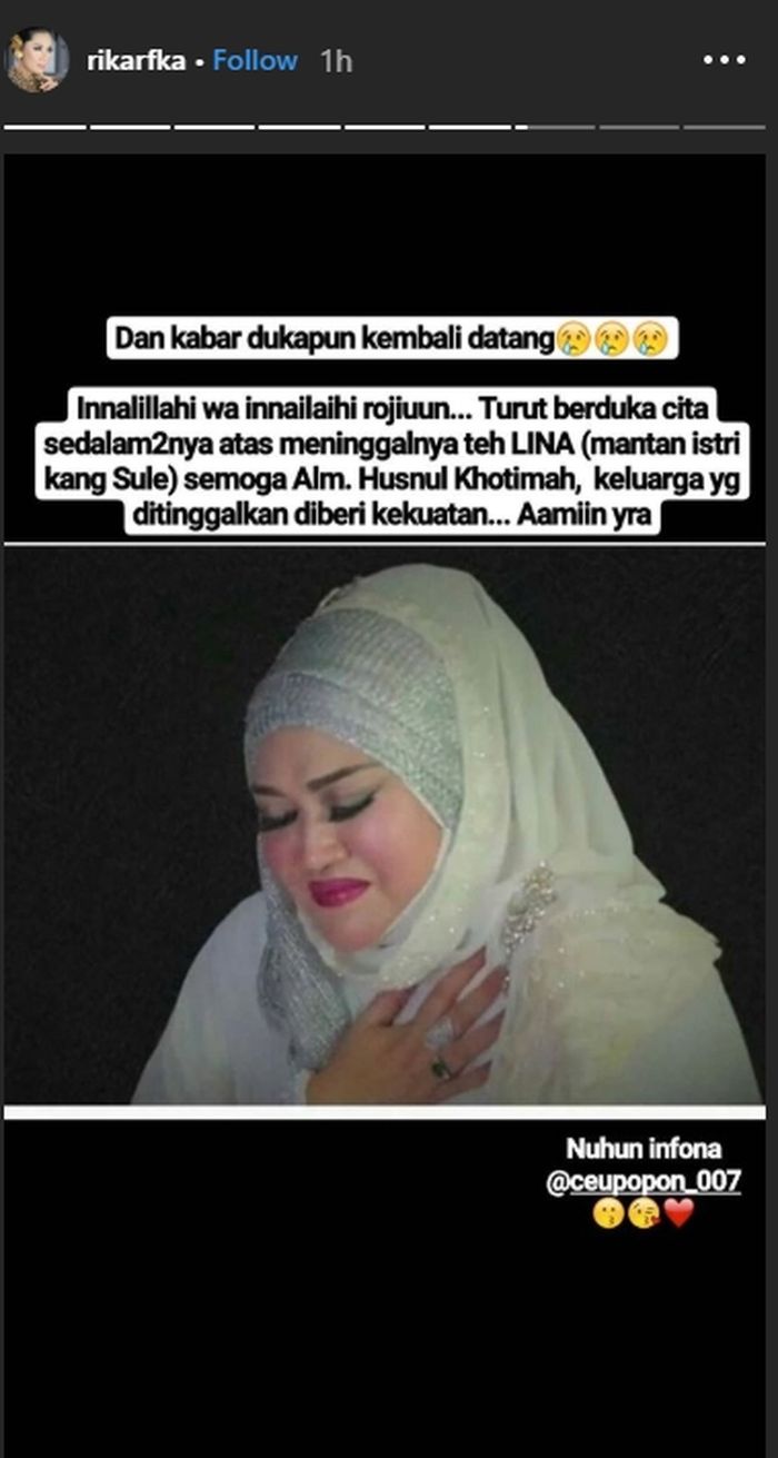 Penyanyi sunda, Rika Rafika juga mengunggah postingan belasungkawa atas kepergian Lina.