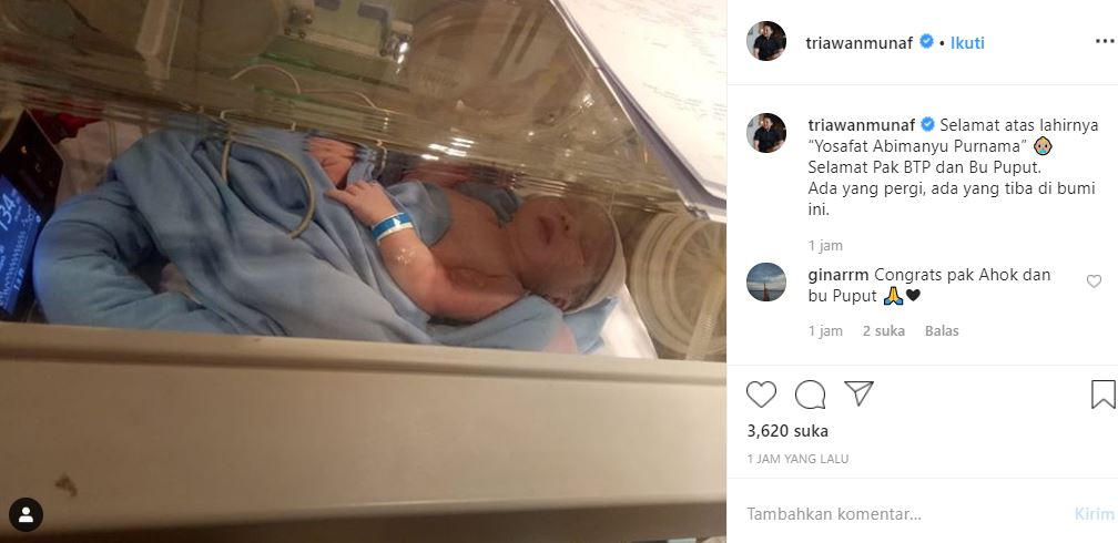 "Selamat atas lahirnya “Yosafat Abimanyu Purnama” (emoticon bayi laki-laki) Selamat Pak BTP dan Bu Puput.