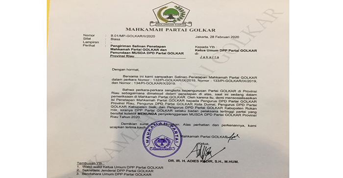 Setelah adanya pembatalan Musyawarah Daerah (Musda) Golkar Riau Minggu (1/3/2020), beredar surat dari Mahkamah Partai.