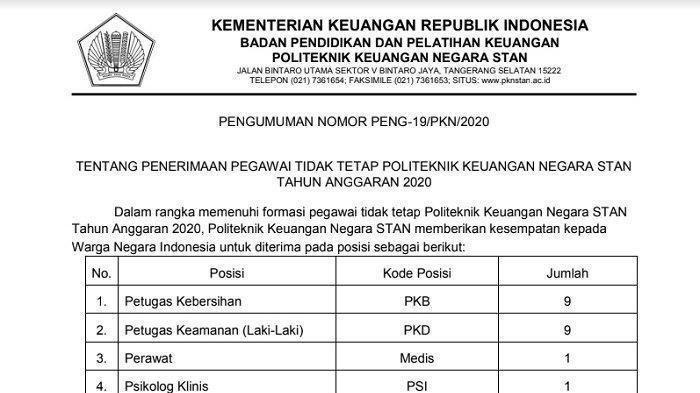Berikut informasi Lowongan Kerja atau Penerimaan Pegawai Tidak Tetap Politeknik Keuangan Negara STAN dilansir TRIBUN-TIMUR.COM dari pengumuman resmi nomor PENG-19/PKN/2020 di laman www.pknstan.ac.id: